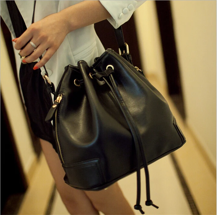 Обзор статей: 2016 новый Женский Pu Кожаная Сумка Простой Шнурок Ведро Сумки Креста Тела Плече Сумки Бесплатная доставка Черный Белый Красный фиолетовый